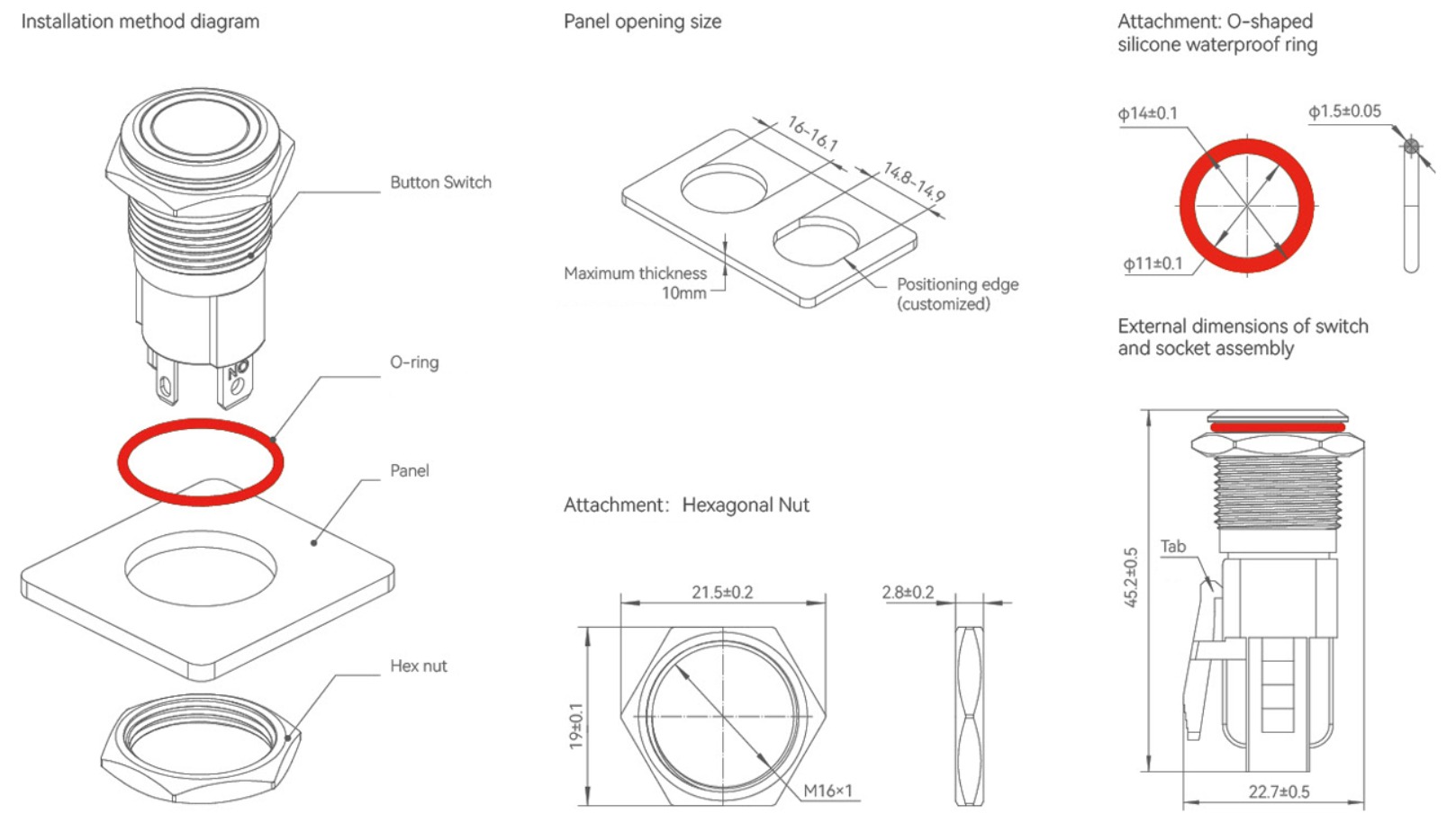 The 16mm High Current 15A Metal Push Button Switch presents a compact yet powerful solution where space is limited but current demands are high. With a rugged metal body and enlarged silver contacts, it reliably handles up to 15 amps. The self‐locking mechanism ensures stable latching, while its thickened terminals reduce overheating during prolonged operation. Built for durability, it offers up to one million mechanical cycles, and its IP65 rating (customizable to IP67) shields the internal components from dust and water ingress.