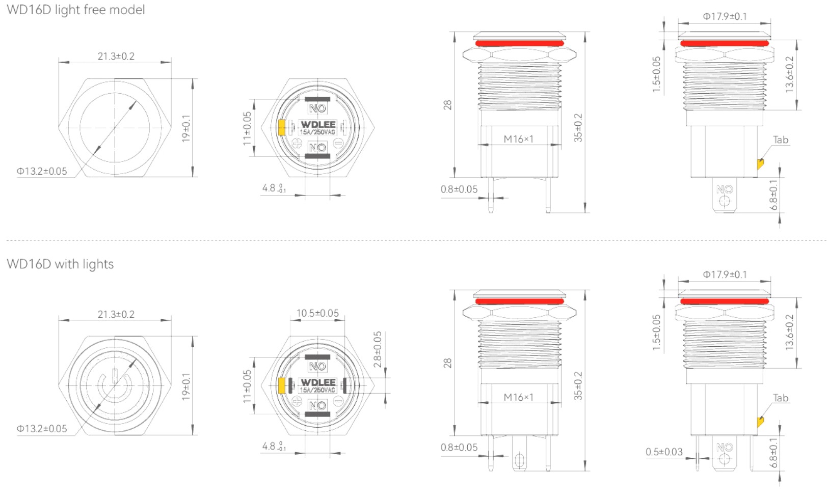 •             WD16D-P1-C-□□-S-1 High Current Metal Pushbutton Switches WD16D-P1-C-□□-S-1