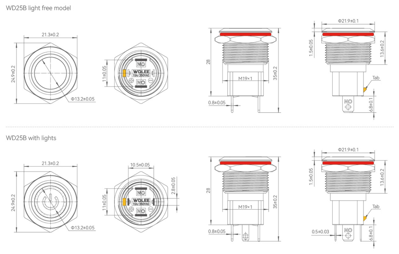 •             WD19D-P1-E-□□-S High Current Metal Pushbutton Switches WD19D-P1-E-□□-S
