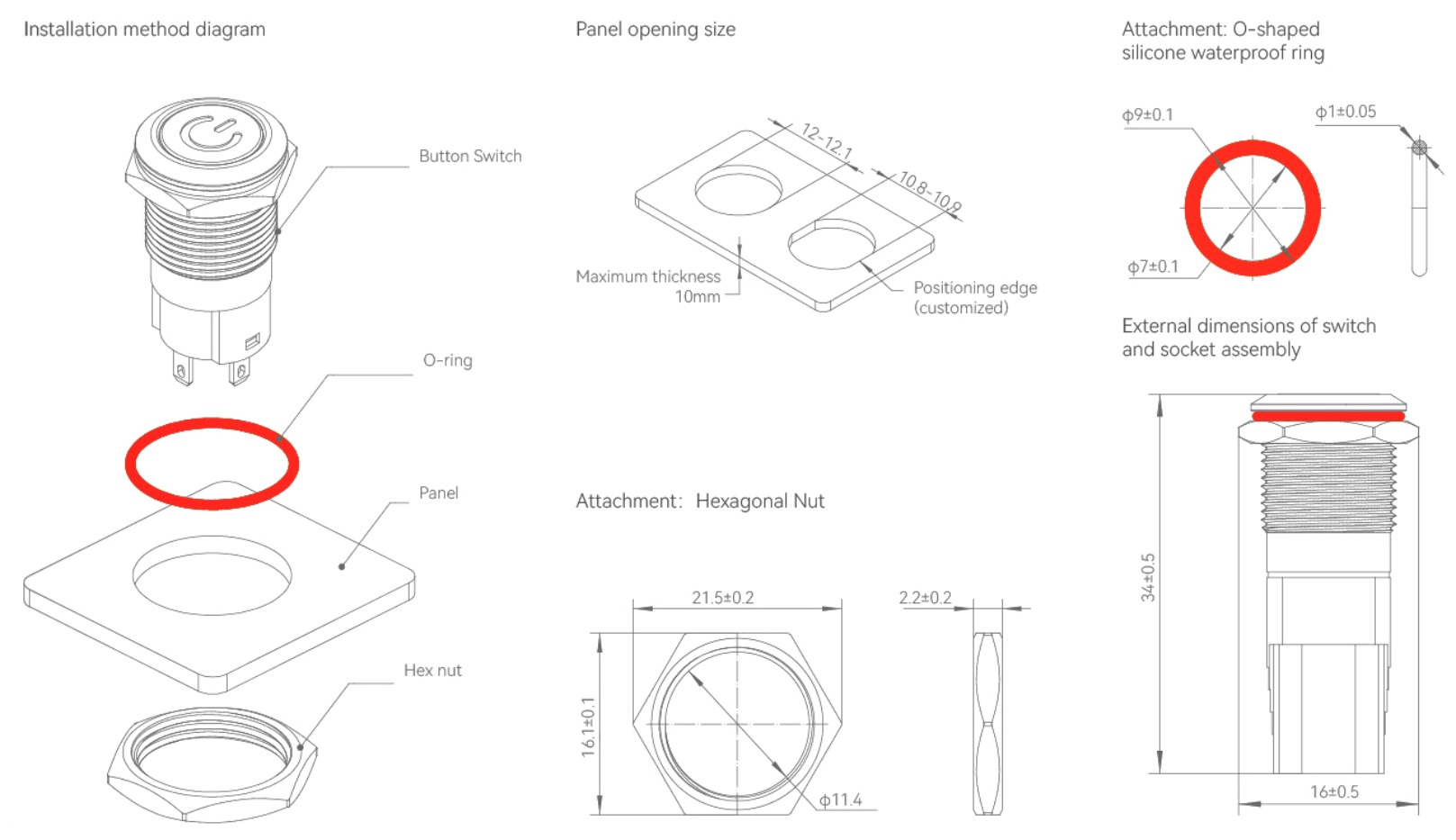 This 12 mm metal push button is engineered for 220-250 V AC control circuits, delivering reliable switching in harsh environments. The robust metal housing, paired with an IP67 rating, ensures full protection against dust ingress and immersion up to 1 meter, making it ideal for outdoor or industrial panels. Featuring high-voltage contact components with gold-plated pins to reduce oxidation and improve conductivity, it is designed for both safety and longevity.